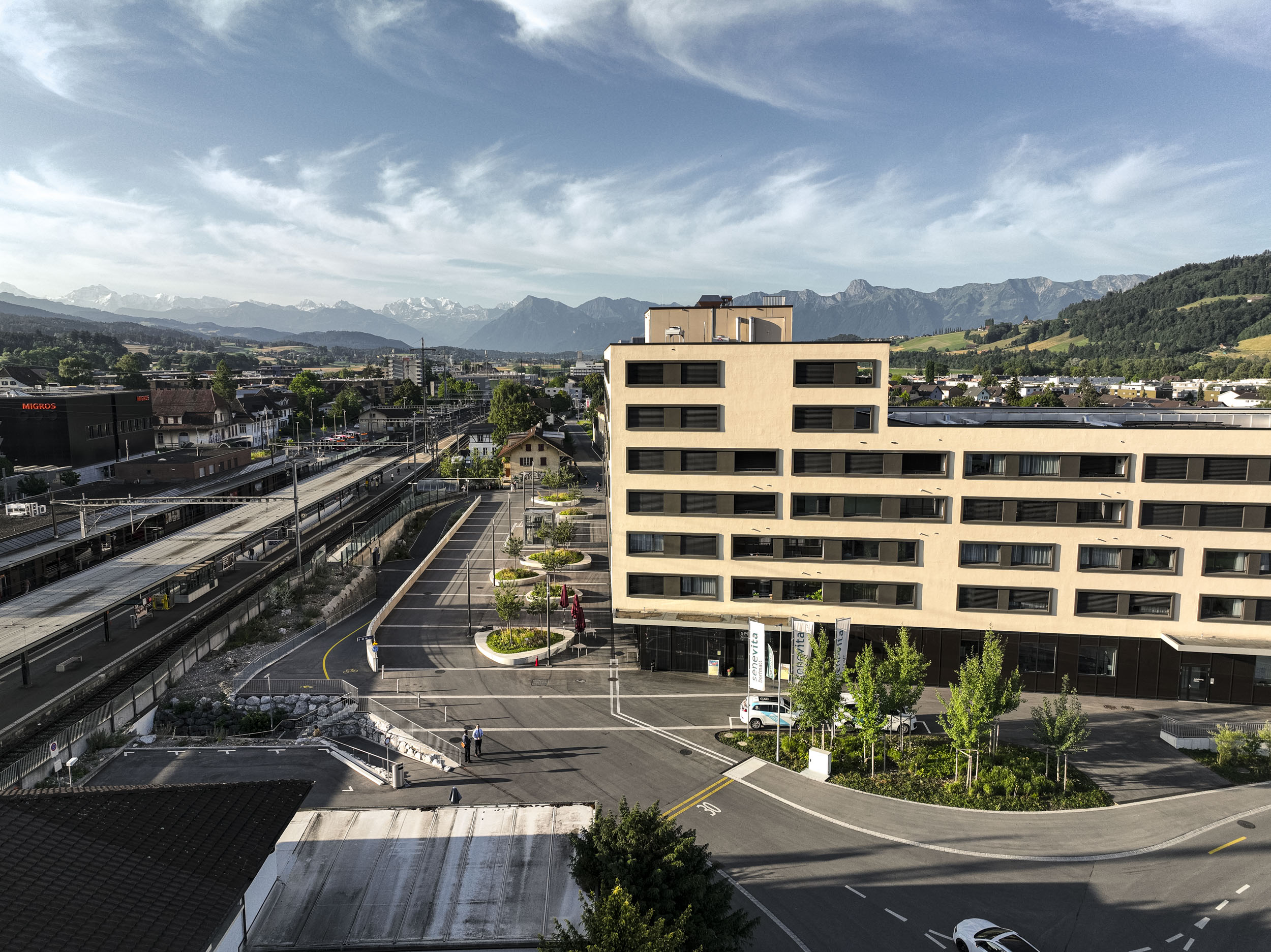 Im Herzen vom Münsingen entstand ein neues Altersheim im belebten Umfeld des Bahnhofsareales auf der einen Seite und ruhigem Gartenbereich auf der anderen Seite. Zahlreiche Aufenthaltsmöglichkeiten auf grossen Plätzen und in kleinen idyllischen Bereichen stehen zur Verfügung, wilde Blumenpracht und Schatten spendende Bäume. Hochbeete laden zum Gärtnern ein, Rundwege zu Spaziergängen und Ausruhen lässt es sich herrlich im bestuhlten Terrassenbereich.